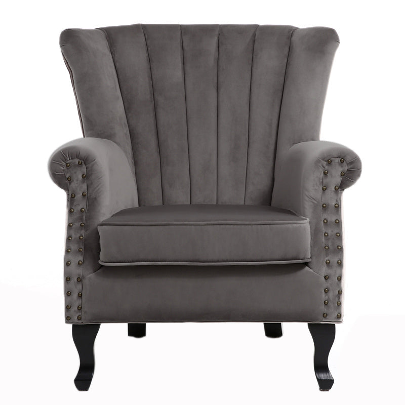 - Eleganter Samtsessel: Dieser stilvolle Polstersessel verleiht Ihrem Wohnraum einen Hauch von Luxus mit seinem kanalgesteppten Rücken und den verzierten Seiten.